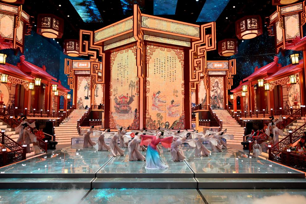 近年來,遼寧春晚不斷將獨特的區(qū)域文化深度融入節(jié)目中。2023年復刻遼代壁畫《散樂圖》,2024年以查海遺址“石堆塑龍”為靈感創(chuàng)作節(jié)目《龍騰》,2025年從《簪花仕女圖》中提取意象打造詩畫舞蹈……遼寧春晚正在成為東北文化的講述者。