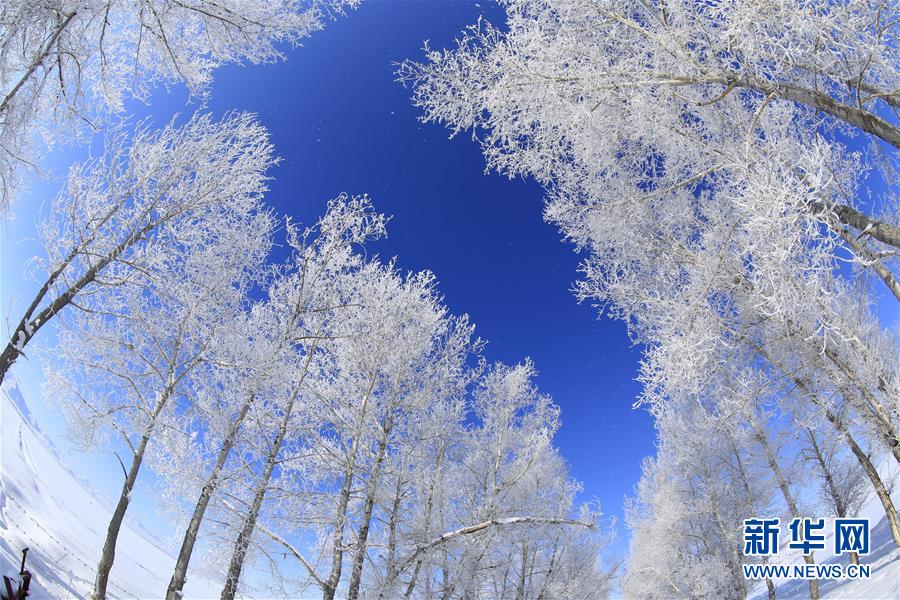 1月3日在新疆阿勒泰地區(qū)富蘊縣吐爾洪鄉(xiāng)拍攝的霧凇美景。藍(lán)天映襯下的冰雪世界顯得一片肅穆。 新華社發(fā)(丁寧 攝)
