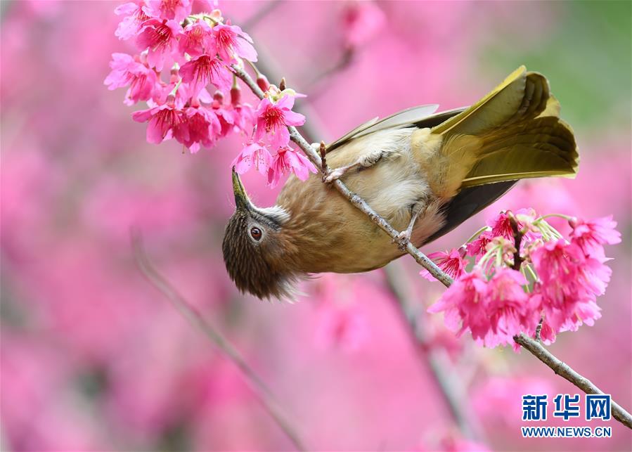 2月18日,一只綠翅短腳鵯鳥在福州森林公園櫻花園采食花蜜。隨著天氣轉(zhuǎn)暖,福州國家森林公園的2.5公頃櫻花園內(nèi)櫻花盛開,引得眾多鳥兒前來采食花蜜,春色盎然。 新華社記者 姜克紅 攝