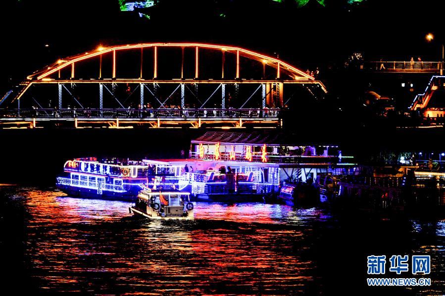 6月14日,一艘游輪從黃河蘭州段中山橋下穿過。自6月12日起,蘭州黃河游輪夏季夜航航線正式開通。據(jù)了解,作為黃河蘭州段水上旅游重點(diǎn)線路,該航線由蘭州市城關(guān)區(qū)蘭州港碼頭和白塔山碼頭始發(fā),每晚20時(shí)起開行,全程約6公里,運(yùn)行時(shí)長50分鐘左右。游客可以乘坐豪華游輪欣賞黃河夜景,感受蘭州黃河風(fēng)情線別樣魅力。新華社記者 陳斌 攝
