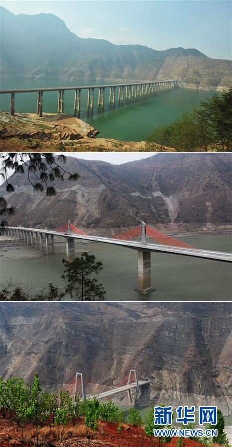 雅西高速瀑布溝庫區(qū)路段3座跨大渡河特大橋:青杠嘴特大橋(上圖)、觀音巖特大橋(中圖)、蘇村壩特大橋(下圖,拼版照片,攝于2012年4月12日)。1935年5月24日、25日間,紅軍“十七勇士”在槍林彈雨中,以一條木船強(qiáng)行從安順場渡河,在國民黨軍視為天險的大渡河防線上,撕開了一個缺口,為紅軍沿大渡河兩岸夾河北上奪占瀘定橋創(chuàng)造了有利條件。 “紅軍不怕遠(yuǎn)征難,萬水千山只等閑?!遍L征譜寫了一曲人類征服自然的凱歌,峽谷激流、雪山草地、物資匱乏、生命禁區(qū),這一切都不能阻擋紅軍前進(jìn)的步伐。80年過去,滄海桑田,紅軍長征走過的荒郊野嶺,如今樓宇林立,欣欣向榮;徒步翻越的大山、攻克的關(guān)隘、沼澤遍布的草地、泅渡的河流,修起了通暢快捷的公路和大橋……長征之路發(fā)生了翻天覆地的變化,昔日的艱難險阻正漸漸變成康莊通途。新華社記者江宏景攝