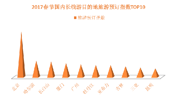 一般情況下,春節(jié)期間的國內(nèi)長線游(行程3日以上,居住地300公里外)需求的出游人數(shù)在總體長線游需求中占比最大?!秷?bào)告》數(shù)據(jù)顯示,北京、哈爾濱、長白山、廈門、廣州、牡丹江、亞布力、吉林、三亞、昆明是2017年春節(jié)期間最熱門的十個(gè)目的地(以《報(bào)告》發(fā)布時(shí)的線路預(yù)訂數(shù)據(jù)統(tǒng)計(jì)),其中哈爾濱、長白山、牡丹江、亞布力、吉林五個(gè)目的地全部來自東北地區(qū),春節(jié)期間冰雪游線路的火爆是它們上榜的共同原因,廈門、三亞、昆明等則為黃金周國內(nèi)游傳統(tǒng)熱門目的地。另外,不同城市居民春節(jié)國內(nèi)長線游的目的地偏好略有差異,例如,北京最受歡迎的春節(jié)國內(nèi)游目的地主要有廣州、珠海、哈爾濱、長白山,上海最受歡迎的春節(jié)國內(nèi)游目的地主要有長白山、北海、三亞、北京等,廣州最受歡迎的春節(jié)國內(nèi)游目的地主要有貴陽、張家界等。