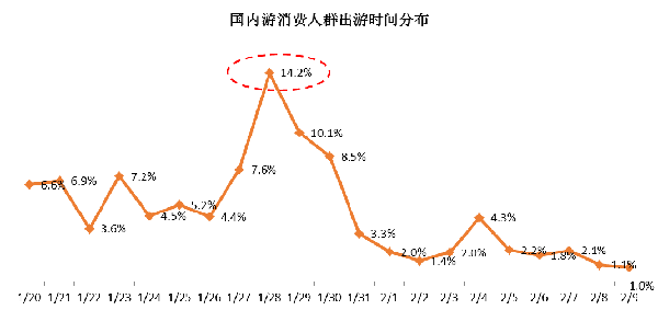 出游時(shí)間方面,春節(jié)國內(nèi)長線游者選擇節(jié)前錯(cuò)峰游的占比38.3%,春節(jié)黃金周期間出游的占比47.2%,1月28日(正月初一)達(dá)到客流峰值,選擇節(jié)后錯(cuò)峰出游的僅占比14.5%。