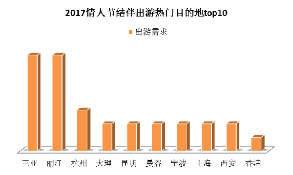 情人節(jié)當(dāng)天在線結(jié)伴出游者的目的地選擇既有國(guó)內(nèi)的也有國(guó)外的,比較熱門的目的地主要有:三亞、麗江、杭州、大理、昆明、曼谷、寧波、上海、西安、香港。