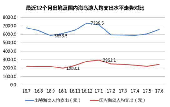 《報告》提供的同程旅游海島游消費數(shù)據(jù)顯示,最近一年(2016年7月至2017年6月)出境海島游消費人群用于購買旅游產品(線路、交通、住宿等,不含購物消費)的人均支出為6340.6元,國內海島游人均支出為2368.9元。從時間軸來看,出境海島游和國內海島游的人均支出水平明顯與出游客流的季節(jié)呈現(xiàn)出同步變化趨勢,出境海島游旺季人均支出最高可達7339.5元,國內海島游旺季人均支出最高可達2962.1元。