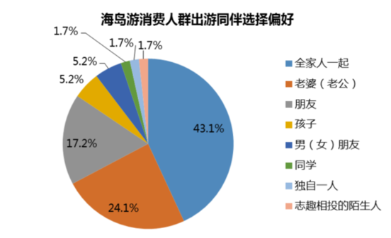 出游同伴選擇偏好分析可從消費人群社會關系的角度間接看到當前海島游的客群結構?!秷蟾妗坊谕搪糜魏u游用戶數(shù)據(jù)分析顯示,43.1%的人選擇全家人一起出游,24.1%的人選擇與伴侶一起出游。結合人群年齡分布數(shù)據(jù)來看,家庭、新婚夫婦、情侶、親子是海島游的核心客群。