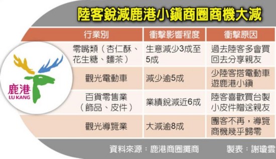 大陸游客減少后,臺(tái)灣旅游業(yè)“冷颼颼”。據(jù)臺(tái)灣《中國時(shí)報(bào)》報(bào)道,過去大陸游客團(tuán)赴臺(tái),若住宿中部準(zhǔn)備出發(fā)前往日月潭途中,必定會(huì)先到訪鹿港小鎮(zhèn)。民意代表王惠美觀察,大陸游客不來之后,光是中山路上的店家生意就掉了一半。觀光電動(dòng)車、賣小吃和皮件的攤商感受最深,曾經(jīng)忙到應(yīng)接不暇的導(dǎo)覽解說員,現(xiàn)在只能主動(dòng)出擊,通過民間協(xié)會(huì)發(fā)函邀請大陸游客組團(tuán)赴臺(tái)交流參訪。