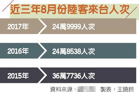 近三年8月份大陸游客赴臺(tái)人次。(圖片來源:臺(tái)灣《旺報(bào)》)