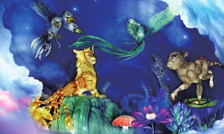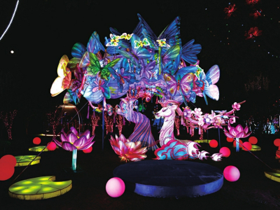 在百花的傳說中,十二月令花神的傳說最令人神往。在桃花島上,梅花、杏花、桃花、牡丹、石榴、蓮花、蜀葵、桂花、菊花、木芙蓉、山茶、水仙,各路花神身著華服,在所屬花燈前翩翩起舞,燈光人影交織,盡顯浪漫。“十二花神”每晚分時段在桃花云臺,跳起如云似幻的祈福舞,笑容明媚,面若桃紅,傾倒眾人。無人機組集合成孔明燈形狀,載著每個人最虔誠的心愿緩緩升空。“十二花神”隨即走下“神臺”,出沒在各個角落,讓整個桃花島亦真亦幻。穿行其中,與“花神”擦肩而過,仿佛穿越時空,進入神話世界。