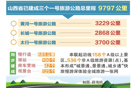 截至今年10月10日,山西省已建成三個(gè)一號(hào)旅游公路總里程9797公里。其中,黃河一號(hào)旅游公路3229公里、長城一號(hào)旅游公路2868公里、太行一號(hào)旅游公路3700公里,同步建成慢行道685公里、驛站100個(gè)、房車營地42個(gè)、觀景臺(tái)125個(gè),串聯(lián)起沿線158個(gè)A級(jí)以上景區(qū)、536個(gè)非A級(jí)旅游資源(點(diǎn)),基本形成“城景通、景景通、城鄉(xiāng)通”快旅慢游深體驗(yàn)全域旅游一張網(wǎng)。