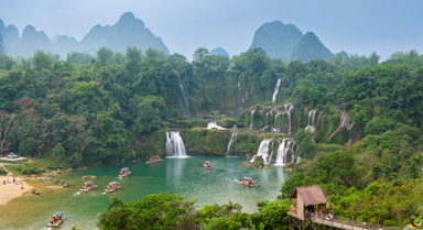 德天瀑布位于廣西壯族自治區(qū)崇左市大新縣碩龍鎮(zhèn)德天村,中國與越南邊境處的歸春河上游。瀑布氣勢磅礴、蔚為壯觀,與緊鄰的越南板約瀑布相連,是亞洲第一、世界第四大跨國瀑布。劉國興攝(人民圖片網(wǎng))