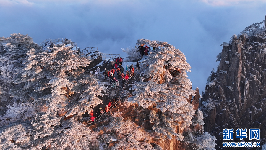 近日,安徽黃山雪后初霽,山峰銀裝素裹,滿(mǎn)目玉樹(shù)瓊枝。云霧如同舞者般在白雪皚皚的峰巒間穿梭嬉戲,宛如一幅渾然天成的水墨丹青。