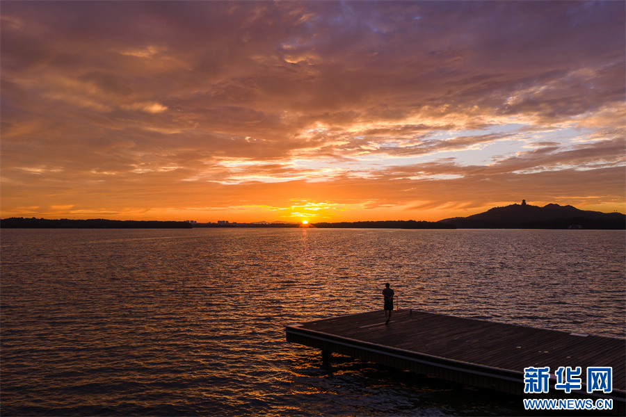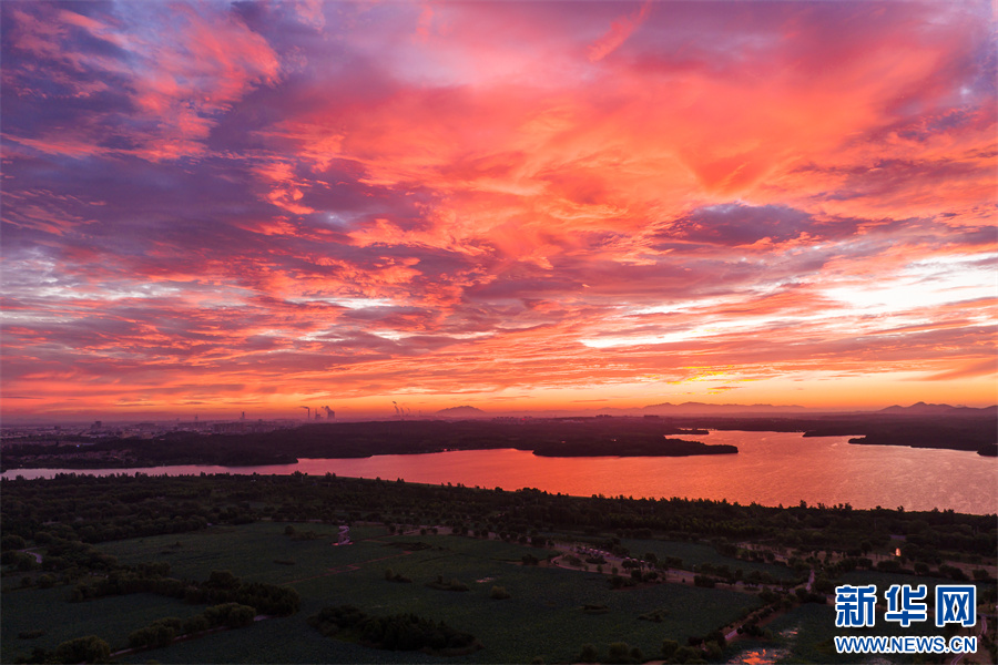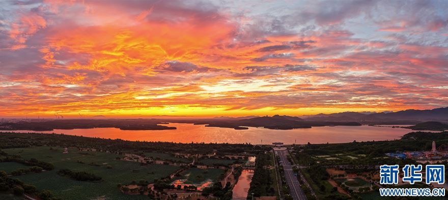 近日,安徽省池州市平天湖上空出現(xiàn)絕美朝霞景觀。新華網(wǎng)發(fā)(程爽 攝)