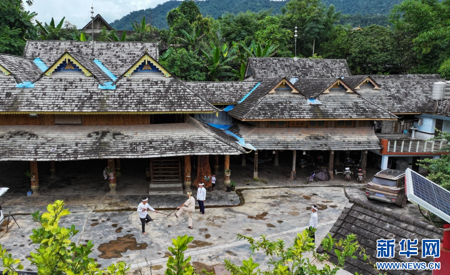 8月16日,波罕丙帶領(lǐng)徒弟們練習(xí)傣族武術(shù)(無人機(jī)照片)。新華網(wǎng)發(fā)(李云生 攝)