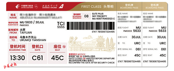 此次升級不僅注重文化表達,更著力提升服務(wù)體驗。登機牌對登機口、起飛時間、座位號等關(guān)鍵信息進行了“放大提亮”處理,通過字體加粗、色彩對比等設(shè)計,顯著提升了信息辨識度,特別方便老年旅客快速獲取信息,有效降低誤機風(fēng)險,體現(xiàn)了東航精細化服務(wù)理念。