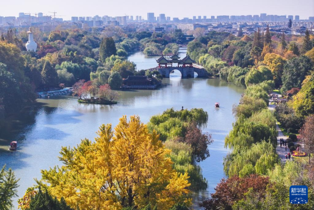 11月18日,游客在江蘇揚(yáng)州瘦西湖風(fēng)景區(qū)游覽(無人機(jī)照片)。新華社發(fā)(孟德龍攝)