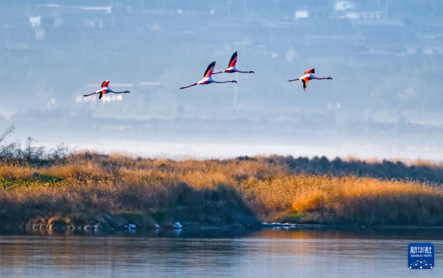 11月19日,火烈鳥在山西省運(yùn)城鹽湖濕地飛翔。新華社發(fā)(薛俊攝)