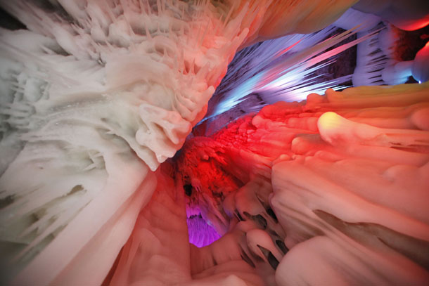 第二天一早,閆鵬和他的朋友全副武裝再次來到了這里,決心對(duì)這個(gè)洞探個(gè)究竟。他們拉了一條繩子進(jìn)入洞中,里面黑咕隆咚,腳底滑得根本沒有腳蹬的地方。后來到了一個(gè)稍微開闊的地方,站穩(wěn)腳之后,拿火把四周一看,眼前豁然開朗。他們仿佛置身于一座晶瑩的宮殿,四處都是冰的世界:冰柱、冰錐、冰瀑、冰筍、冰花。