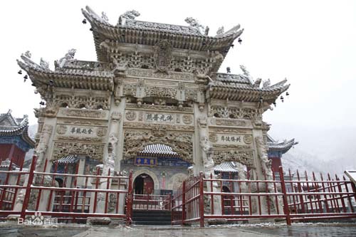 影壁中間鑲嵌有一石雕刻,文殊騎獅居中,人物花卉滿(mǎn)布四周,構(gòu)圖嚴(yán)謹(jǐn),神情逼真。向北登108級(jí)臺(tái)階即達(dá)山門(mén),門(mén)前漢白玉石獅一對(duì),勾欄小拱橋一座,石牌坊一座,旗桿高聳于兩側(cè),雕工均佳。其中石牌坊最引人神往,從基石,抱柱,斜戧,額枋,斗拱到瓦頂,脊獸,無(wú)一不是精雕細(xì)刻,人獸,花卉,流云,山水等分布殿內(nèi),玲瓏剔透,它共有三門(mén)六柱,呈“一”字形,整體雄偉壯觀,巧奪天工,據(jù)說(shuō)是由工匠耗時(shí)六年才建成。牌坊上刻有89條蛟龍,鱗爪俱現(xiàn),神態(tài)逼真;人物表情栩栩如生。游人觀后,無(wú)不交口稱(chēng)贊,印象深刻。寺內(nèi)三座院落橫向排列,相互串通,又各有山門(mén),自成風(fēng)格。東院為殿院,依地勢(shì)分前后兩進(jìn),除山門(mén)外,中線上還有佛殿兩座,圍枝廂房配殿,塑像俱存,彩繪房和獻(xiàn)亭,曲廊環(huán)繞,雙塔高聳,其中普濟(jì)禪師塔雕尤為精致。距龍泉寺西北里許的山坡,有一座楊業(yè)的瘞骨塔,六角、三級(jí),高約10米。傳說(shuō)楊業(yè)死后,五郎將其尸骨葬此,并建塔紀(jì)念。宋太宗后來(lái)追封楊業(yè)為楊令公,故后人稱(chēng)此塔為令公塔。 (責(zé)任編輯:李冬梅) |