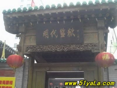 “蘇三監(jiān)獄”在今洪洞縣政府院內(nèi)西南,亦即明洪洞縣衙西南角。一進掛有“明代監(jiān)獄”匾額的大門,首先看到的便是蘇三的塑像,外院當年監(jiān)獄的辦公場所,右邊的院落是普通監(jiān)牢,中間是過道,兩邊共有監(jiān)牢十余間,過道頂上布有鐵絲網(wǎng),網(wǎng)上掛有銅鈴,一有犯人企圖越墻逃跑,便會觸響銅鈴。過道的盡頭,正對的是獄卒的值班室,右面的墻上有獄神的供位,傳說當年囚犯入獄都要參拜獄神,就是獄神下面的墻基處,有一小洞,是當年運送尸體的出口,犯人在獄中病死或是被打死,是不能從大門抬出去的,只能從這個小洞拉出去。過道盡頭的左邊,便是死囚牢的大門,死囚牢雙門雙墻,門上畫有狴犴,狴犴是龍的兒子,長得卻象老虎,因此人們誤稱為“虎頭牢”,大約是因為龍生九子,子子不同,狴犴專門掌管刑獄,大門只有一米六高,所有進入死囚牢的人都要在狴犴像前低頭,顯示對法律的敬畏。進了門洞,里面還有一道門,而這兩道門卻是一扇從右開,一扇從左開,不明就里的囚犯如果越獄,往往出了第一道門卻怎么也打不開第二道門,一個小小的改動就能起到拖延犯人越獄時間的作用,不能不佩服古人的智慧。進入死牢院,右面是一堵高墻,左面就是當年關(guān)押蘇三的牢房,里面有蘇三的塑像。死囚院的中央還有當年蘇三坐監(jiān)時洗衣的水井和石槽,井口留有一道道繩索磨下的印記,井口只有半尺多寬,這是為了防止死囚投井自殺。據(jù)說,右面的高墻里灌裝的都是流沙,如果犯人想要挖墻越獄,流沙便會從挖開的小口中源源不斷地流來,使其難以挖通圍墻。1964年我國著名考古學(xué)家王冶秋先生曾在洪洞考察確認,蘇三監(jiān)獄為我國罕見的明代監(jiān)獄,并題詩曰:“虎頭牢里羈紅妝,一曲攪亂臭水漿。王三公子今何在?此處空留丈八墻?!笔陝觼y期間,蘇三監(jiān)獄被拆毀。為了使“蘇三監(jiān)獄”這一僅存的明代監(jiān)獄得以保留,洪洞縣人民政府后做出了修復(fù)“明代蘇三監(jiān)獄”的決定。修復(fù)事宜于1984年5月開始,同年10月竣工。