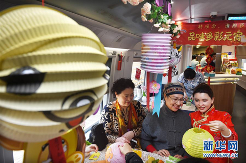 當(dāng)日,中國(guó)鐵路濟(jì)南局集團(tuán)有限公司在部分列車(chē)上開(kāi)展“品味多彩元宵共享幸福旅程”活動(dòng),舉行猜燈謎、品元宵、展茶藝、做花燈等活動(dòng),邀請(qǐng)旅客共同參與。 新華社記者 李紫恒攝