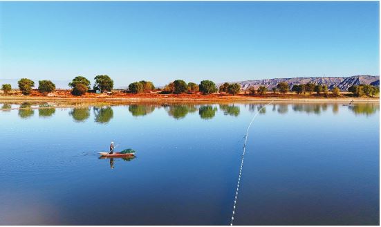 11月29日,萬榮縣汾河灘,漁民劃著小船在魚塘里布網(wǎng)勞作。一人一舟,一山一水,呈現(xiàn)出一幅人與自然和諧共生的美麗畫卷。