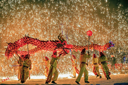 除了誘人的美食,精彩演藝必不可少?!靶麓貉灿巍钡慕k麗花車流光溢彩,演員們身著精致華麗的服飾載歌載舞,與游客熱情互動。限定非遺“祈?;ɑ鹦恪备菐硪粓鲆曈X盛宴,“鐵樹銀花落,萬點(diǎn)星辰開”,火龍鋼花與落花秀相互交融,鐵火流星漫天飛舞,一起感受跨越千年的祝福與熾熱。還有“鬧新春”主題晚會,歌舞、雜技輪番上演。廣大游客還可在歡聲笑語中圍著篝火牽手狂歡,共度闔家團(tuán)圓的美好時光。