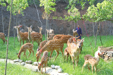 基地采用“公司+基地+合作社+農(nóng)戶”的經(jīng)營模式,鼓勵和扶持農(nóng)戶認養(yǎng)梅花鹿和種植農(nóng)作物,并以訂單式回收,確保農(nóng)戶收益。上桑林村村民劉海軍四年前認養(yǎng)了兩頭鹿,每年每頭鹿凈增收4000多元。“我認養(yǎng)的是公鹿,村里認養(yǎng)母鹿的收入更多,畢竟生下的小鹿都是個人的。還有在基地上班的也不少掙?!?/p>