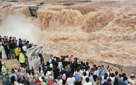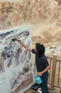 8月10日,一名畫家在吉縣黃河壺口瀑布景區(qū)現場創(chuàng)作(左圖)。連日來,吉縣黃河壺口瀑布水量持續(xù)增大,形成壯美瀑布群景觀,奔騰咆哮的雄姿吸引了眾多書畫愛好者前來創(chuàng)作。