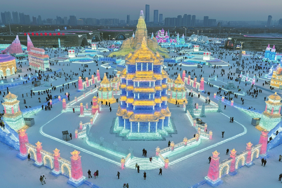 12月17日,游客在哈爾濱冰雪大世界園區(qū)游玩。當(dāng)日上午10時(shí),第二十七屆哈爾濱冰雪大世界正式開(kāi)園迎客。園區(qū)占地面積達(dá)120萬(wàn)平方米,總用冰用雪量突破40萬(wàn)立方米,以歷屆之最的規(guī)模,打造一座冰天雪地的“童話世界”。