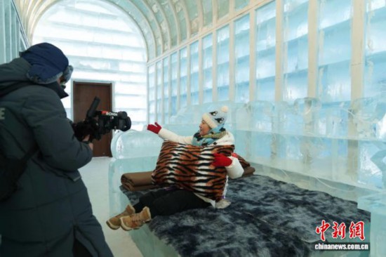 冰堡體驗休息室布置了冰床、冰沙發(fā)等冰制陳設,讓游客沉浸式體驗冰雪住宿的新奇樂趣。 趙宇航 攝
