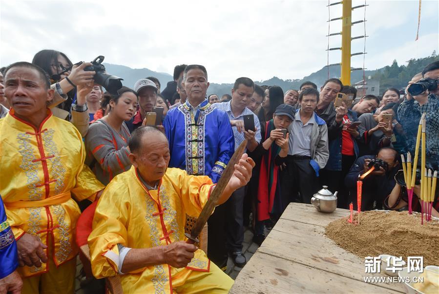 農(nóng)歷十月十五前后,福建西部武平縣各山村陸續(xù)進(jìn)入農(nóng)閑時(shí)節(jié)。按照當(dāng)?shù)仫L(fēng)俗,不同村子各自擇日舉辦民間活動,其中較有代表性的就是“上刀山”絕技。“上刀山”絕技在閩西山村流傳已有數(shù)百年歷史,表演者需光腳順著磨得鋒利閃亮的36把鋼刀,攀登至8米高的杉木柱子頂部,接受長者祝福,祈求風(fēng)調(diào)雨順、五谷豐登。新華社記者 宋為偉 攝