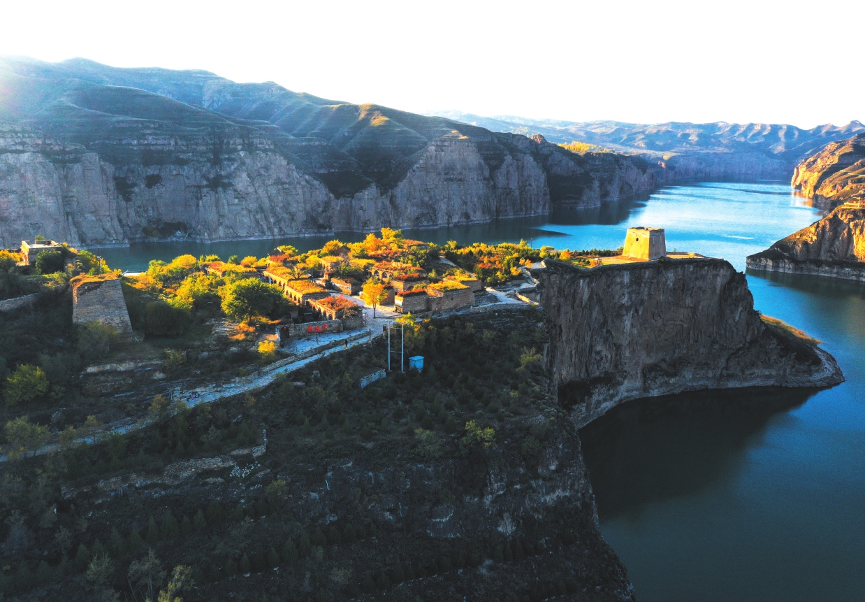 2015年的夏天,我又一次來到老牛灣,105米高的萬家寨水電大壩飛跨晉蒙,黃河水在絕壁中安靜了、變綠了。老牛灣村前的小河倒灌進(jìn)了黃河水,一個(gè)灣成了兩個(gè)灣,團(tuán)團(tuán)地圍住了山村,又好似老牛彎出了兩個(gè)碧綠的牛角,太漂亮了。老鄉(xiāng)們說:“有企業(yè)來開發(fā)道路、景區(qū)了,也有北京游客開車來游玩了,拍照的多,照幾張相就走了?!蓖侨匀粴埰频拈T樓和石板院房,我不知該說什么、能說什么。