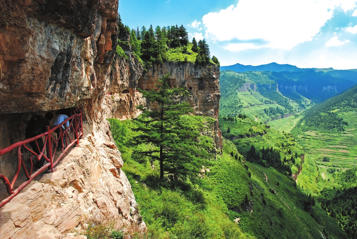 懸崖棧道位于寧武縣清真山,屬額狀丹霞巖地貌,由唐代貞元年間始建的佛教懸空古剎群與棧道共同構(gòu)成。棧道原長42華里,現(xiàn)有修復(fù)段5華里及羅漢殿、毗盧殿等建筑群,其中羅漢殿“回聲階”屬全國五大回聲建筑之一。懸崖棧道的攀爬較為艱險,需要兩個小時,途中要攀登懸崖、臺階,還要穿越僅可容一人通過的山間隧道。