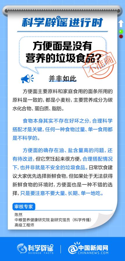方便面的確存在油、鹽含量高的問題,但它烹飪起來很方便,合理搭配情況下,也并非就是不安全的垃圾食品。日常飲食建議大家優(yōu)先選擇新鮮食物,但如果處于無法獲得新鮮食物的環(huán)境時,方便面也是一種不錯的選擇,只是要注意不要大量、長期、單一地吃。(來源:@科學辟謠 @中國新聞網(wǎng) )