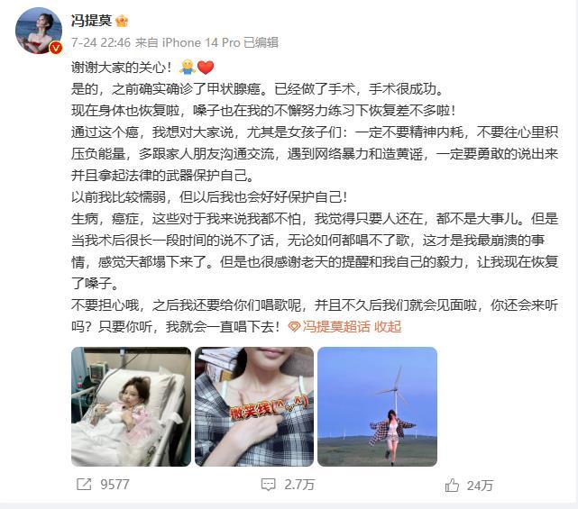 前不久,歌手馮提莫在微博發(fā)文稱自己患甲狀腺癌,經(jīng)手術已恢復。她說,通過這個癌,想對大家說,尤其是女孩子們,一定不要精神內(nèi)耗,不要往心里積壓負能量。