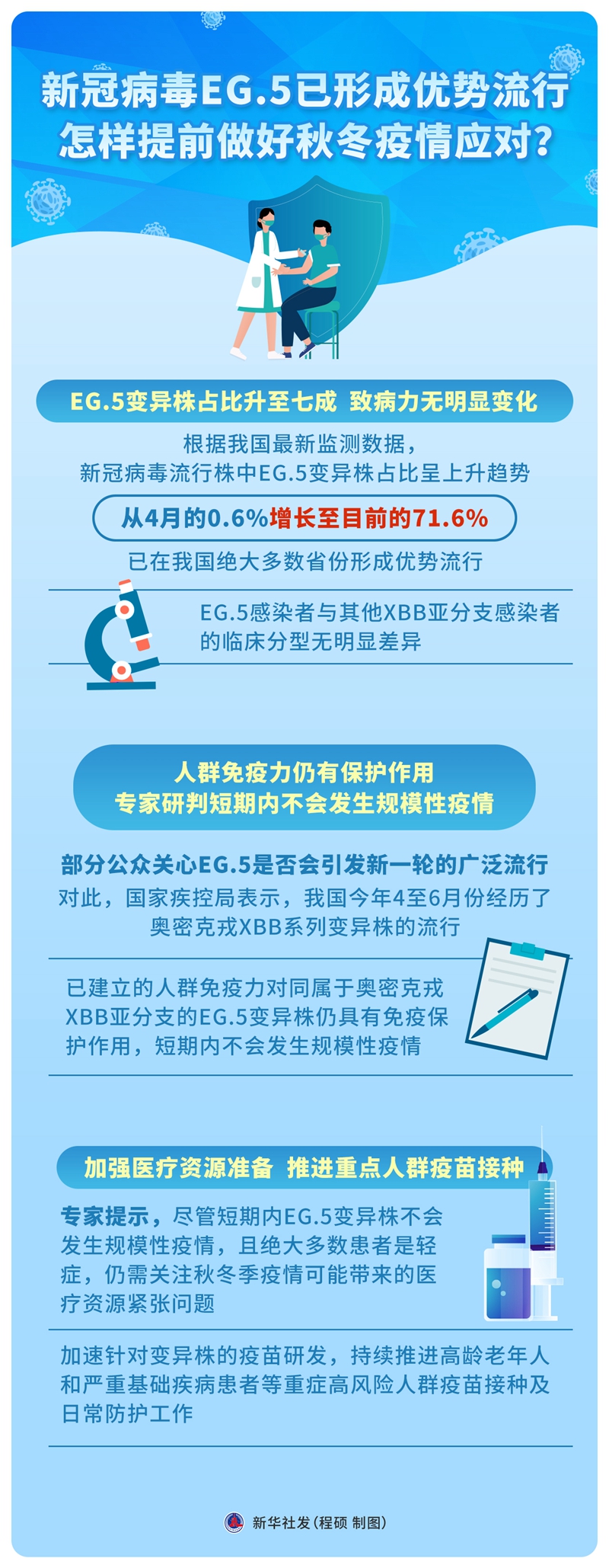 專家提示,盡管短期內(nèi)EG.5變異株不會發(fā)生規(guī)模性疫情,且絕大多數(shù)患者是輕癥,仍需關(guān)注秋冬季疫情可能帶來的醫(yī)療資源緊張問題,加速針對變異株的疫苗研發(fā),持續(xù)推進高齡老年人和嚴(yán)重基礎(chǔ)疾病患者等重癥高風(fēng)險人群疫苗接種及日常防護工作。
