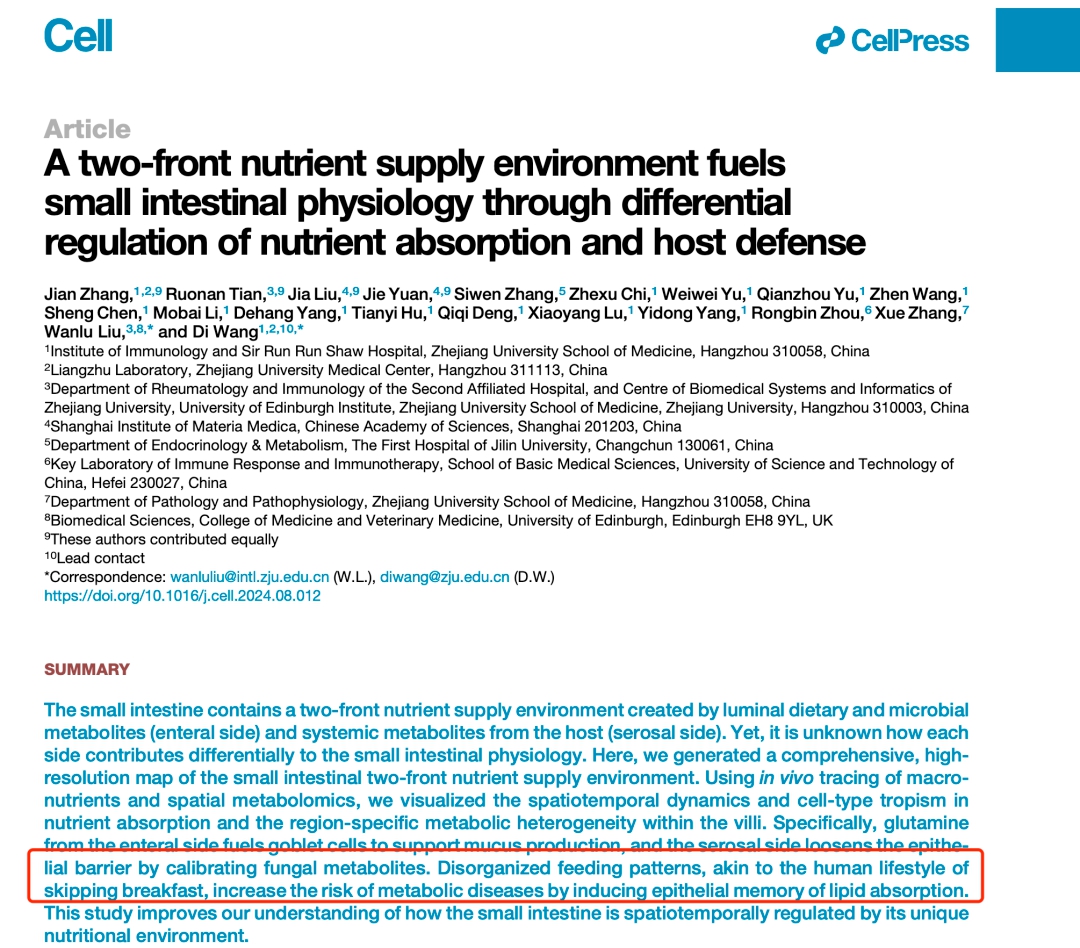 日前,浙江大學(xué)醫(yī)學(xué)院附屬邵逸夫醫(yī)院、浙江大學(xué)愛(ài)丁堡大學(xué)聯(lián)合學(xué)院、中國(guó)科學(xué)院上海藥物研究所的研究團(tuán)隊(duì),在頂尖學(xué)術(shù)期刊《細(xì)胞》(Cell)上合作發(fā)表一篇論文表明,不吃早餐的這種飲食習(xí)慣會(huì)改變小腸對(duì)營(yíng)養(yǎng)物質(zhì)的吸收方式,從而會(huì)增加代謝性疾病的風(fēng)險(xiǎn)。