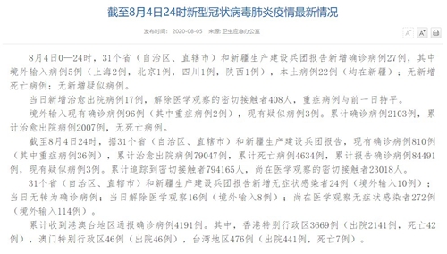 情況顯示,截至8月4日24時,據(jù)31個?。ㄗ灾螀^(qū)、直轄市)和新疆生產(chǎn)建設(shè)兵團報告,現(xiàn)有確診病例810例(其中重癥病例36例),累計治愈出院病例79047例,累計死亡病例4634例,累計報告確診病例84491例,現(xiàn)有疑似病例3例。累計追蹤到密切接觸者794165人,尚在醫(yī)學觀察的密切接觸者23018人。