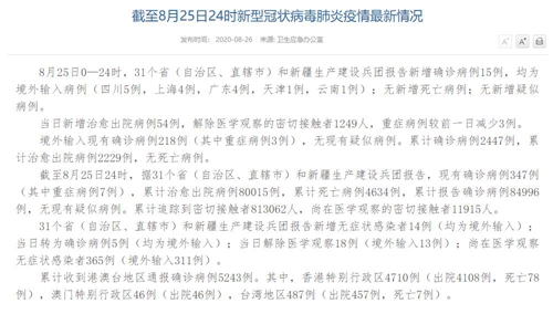 情況顯示,截至8月25日24時(shí),據(jù)31個(gè)?。ㄗ灾螀^(qū)、直轄市)和新疆生產(chǎn)建設(shè)兵團(tuán)報(bào)告,現(xiàn)有確診病例347例(其中重癥病例7例),累計(jì)治愈出院病例80015例,累計(jì)死亡病例4634例,累計(jì)報(bào)告確診病例84996例,無現(xiàn)有疑似病例。累計(jì)追蹤到密切接觸者813062人,尚在醫(yī)學(xué)觀察的密切接觸者11915人。