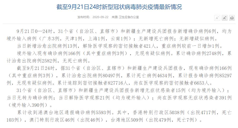 情況顯示,截至9月21日24時(shí),據(jù)31個(gè)?。ㄗ灾螀^(qū)、直轄市)和新疆生產(chǎn)建設(shè)兵團(tuán)報(bào)告,現(xiàn)有確診病例166例(其中重癥病例3例),累計(jì)治愈出院病例80497例,累計(jì)死亡病例4634例,累計(jì)報(bào)告確診病例85297例,無現(xiàn)有疑似病例。累計(jì)追蹤到密切接觸者827716人,尚在醫(yī)學(xué)觀察的密切接觸者6653人。