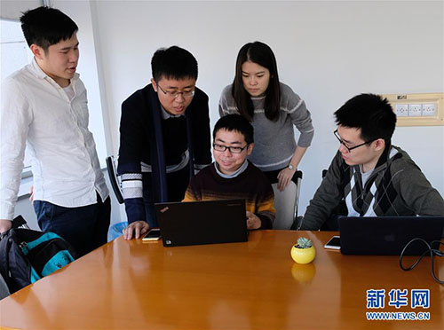 矣曉沅(左三)與同學(xué)們在實(shí)驗(yàn)室討論會上(資料照片)。 新華社發(fā)