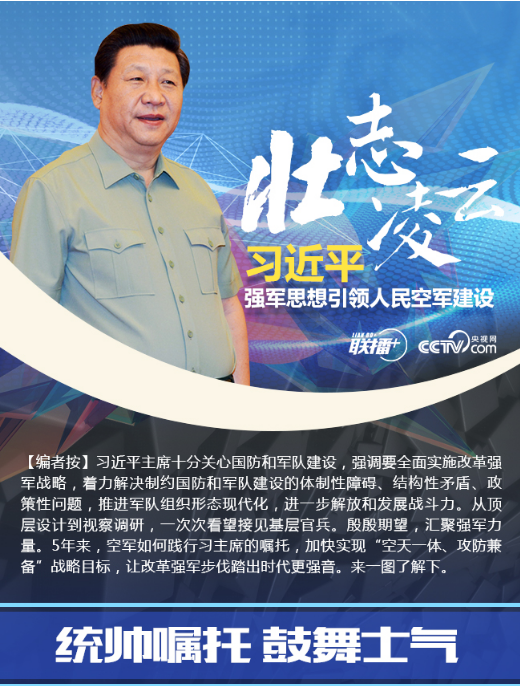 【聯(lián)播+】5年前的4月14日,中共中央總書記、國家主席、中央軍委主席習(xí)近平專程到空軍機(jī)關(guān)調(diào)研空軍建設(shè)和軍事斗爭準(zhǔn)備,代表黨中央、中央軍委向空軍全體官兵致以誠摯的問候,強(qiáng)調(diào)要加快建設(shè)一支空天一體、攻防兼?zhèn)涞膹?qiáng)大人民空軍,為實(shí)現(xiàn)中國夢、強(qiáng)軍夢提供堅(jiān)強(qiáng)力量支撐。