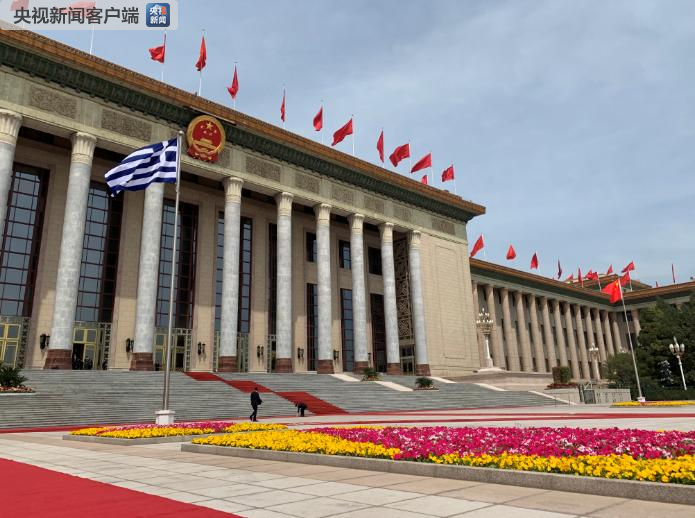△希臘國旗在人民大會堂東門外廣場升起,歡迎希臘總統(tǒng)的儀式即將開始。(央視記者段德文拍攝)