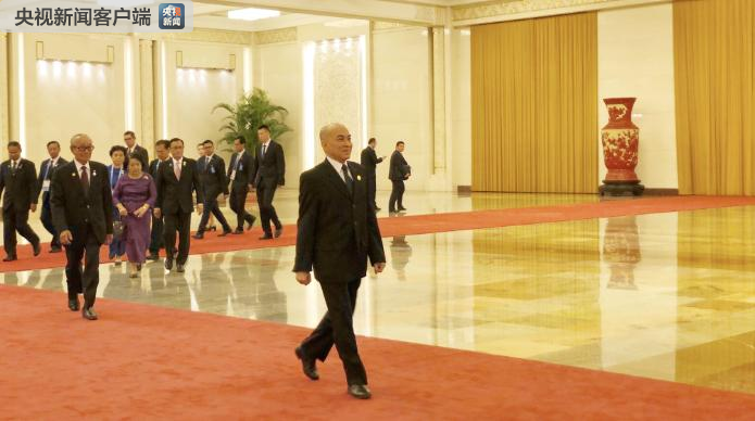 △前來與習近平會面的柬埔寨國王西哈莫尼。(央視記者許永松拍攝)
