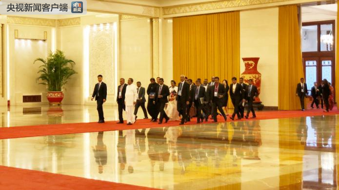 △斯里蘭卡總統(tǒng)西里塞納率團抵達人民大會堂與習近平會面。(央視記者許永松拍攝)
