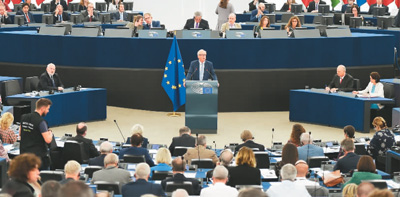 2018年9月12日,歐盟委員會主席容克(中)在法國斯特拉斯堡歐洲議會發(fā)表“盟情咨文”。主題為“歐洲主權時刻”,強調(diào)歐洲需要在塑造全球事務中發(fā)揮作用,包括提升歐元的國際地位等。(新華社/法新社)