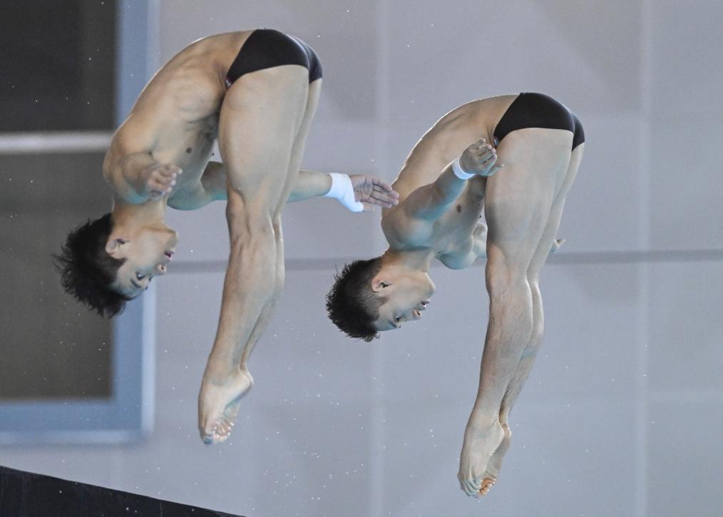 11月27日,陜西浩沙隊選手楊昊(左)/山東洲克隊選手練俊杰在男子雙人10米臺決賽中奪冠。新華社記者程敏攝