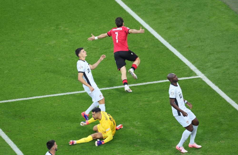 6月26日,格魯吉亞隊(duì)球員克瓦拉茨赫利亞(上)慶祝進(jìn)球。當(dāng)日,在德國蓋爾森基興進(jìn)行的2024歐洲足球錦標(biāo)賽F組第三輪比賽中,葡萄牙隊(duì)0比2不敵格魯吉亞隊(duì)。新華社記者 白雪飛 攝