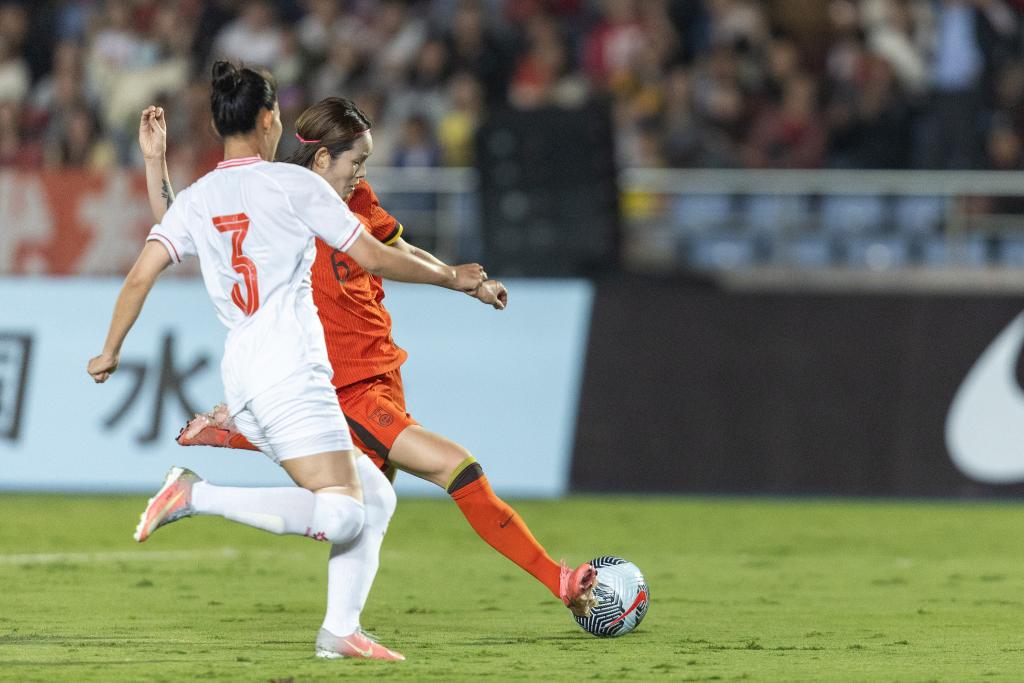 10月29日,中國隊球員張馨(右)在比賽中射門。新華社記者 黃偉 攝
